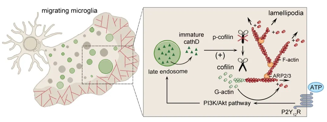 该研究首次发现内吞体-溶酶体囊泡具有调节微丝细胞骨架动态组装的功能。其中,晚期内吞体在小胶质细胞迁移过程中,发挥微丝骨架“拆迁加速器”的作用,通过向胞浆释放未成熟cathepsin D调控cofilin介导的微丝骨架重组,维持小胶质细胞定向迁移。