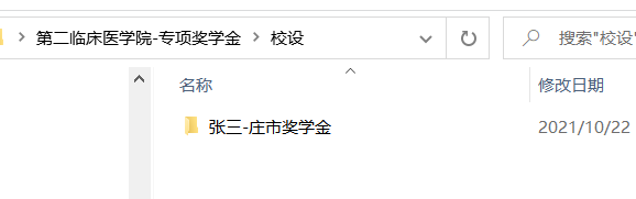 备注:校设和院设奖学金分开汇总(即两个文件夹,文件夹里每个学生的材料单独整理成一个文件夹,以姓名+专项奖学金名称(如张三-庄氏奖学金)。