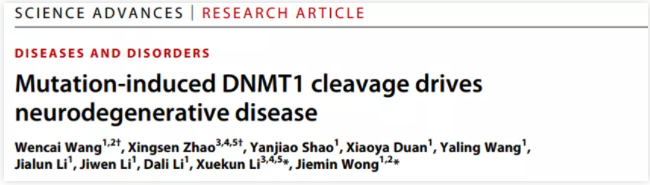 10. W. Wang, X. Zhao, Y. Shao, X. Duan, Y. Wang, J. Li, J. Li, D. Li, X. Li and J. Wong. Mutation-induced DNMT1 cleavage drives neurodegenerative disease. Science Advances. 7, DOI: 10.1126/sciadv.abe8511 (2021).