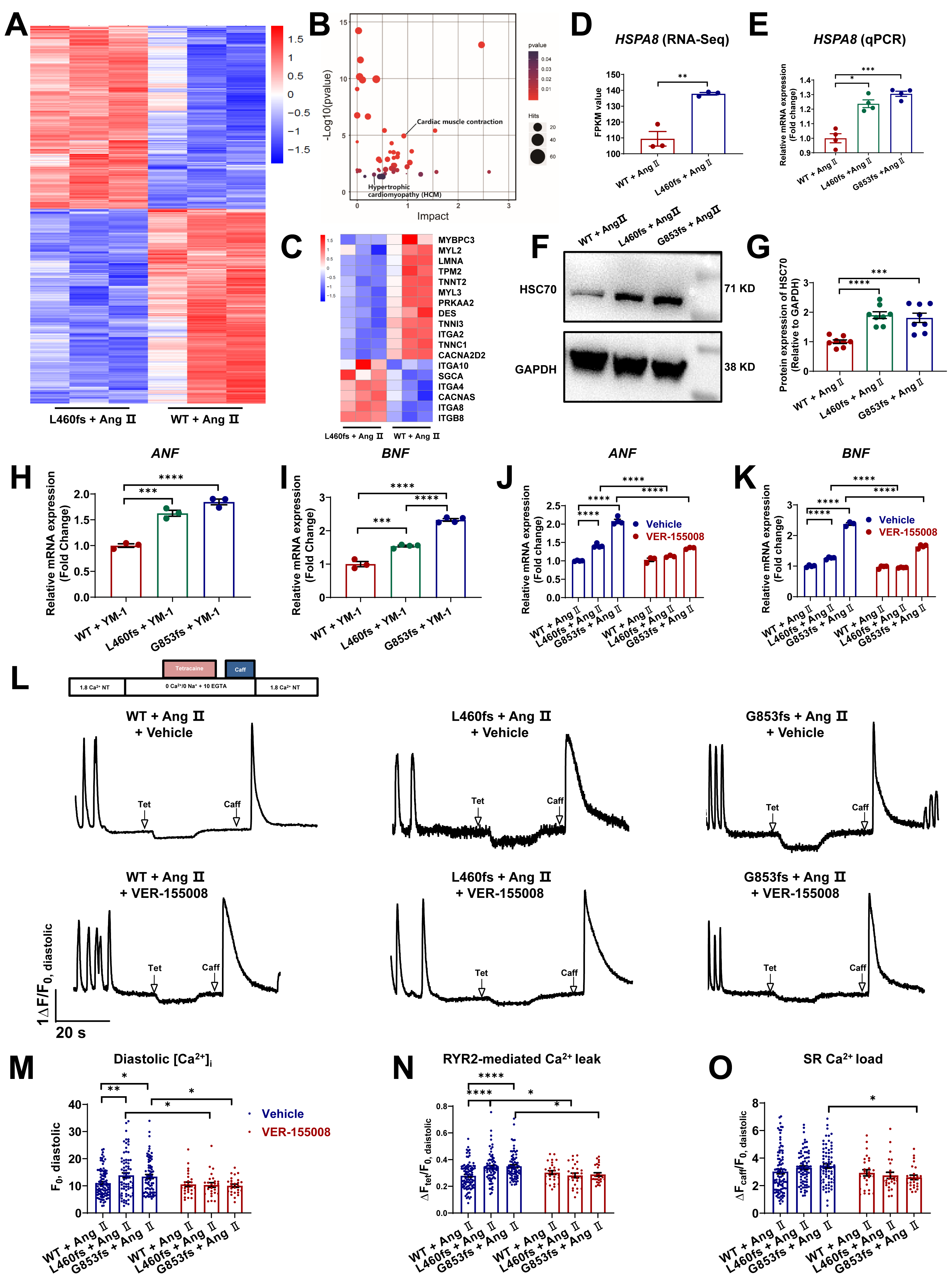 后续,为了探究MYBPC3突变导致HCM的分子机制,研究者对Ang II处理的野生组和突变组心肌细胞进行了转录组测序。数据分析显示:差异表达基因富集在心肌收缩、心肌肥大等信号通路;我们也关注到了HSPA8及其编码蛋白HSC70Ang II处理的突变组心肌细胞中显著上调。既往研究中报道过HSC70MYBPC3存在共定位,同时参与MYBPC3的蛋白降解。为了进一步明晰HSC70 MYBPC3突变相关HCM中的作用,研究者应用HSC70特异性抑制剂(VER-155008)和激活剂(YM-1)分别处理野生组和突变组心肌细胞,实验结果发现:VER-155008能够挽救突变组心肌细胞中由Ang II诱导引起的肥大表型,同时MYBPC3蛋白水平也得到显著恢复;而YM-1可以在基线条件下诱导突变组心肌细胞出现肥大表型,同时引起MYBPC3蛋白表达显著下调。此外,在HSC70抑制剂VER-155008作用下,突变组心肌细胞中RYR2介导的钙漏也显著下调,使得细胞内钙超载显著减轻。