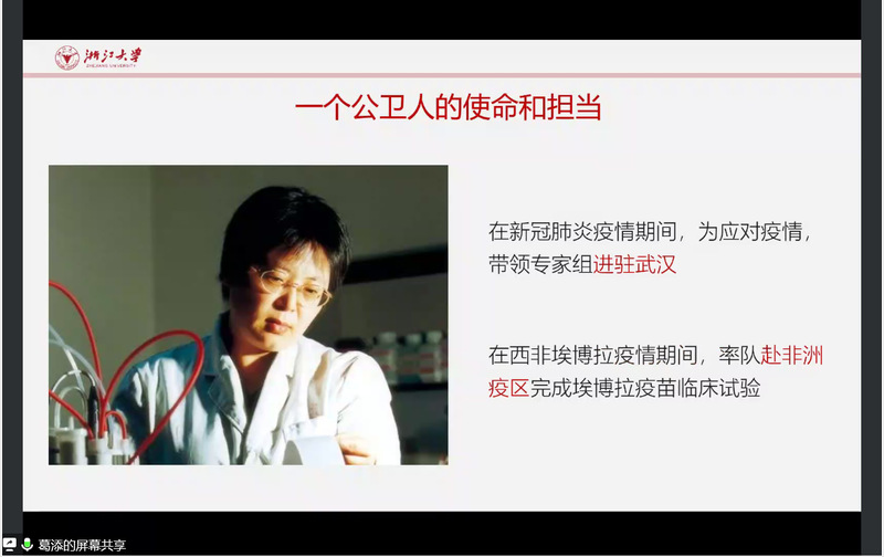葛添同志以自己转专业的契机为切入点,阐释了对预防医学专业的初心。葛添同志从陈薇院士在西非埃博拉疫情期间冒着生命危险,毅然率队赴非洲疫区完成埃博拉疫苗临床试验中,看到了陈薇院士身为一位共产党员、身为一位公卫人的初心使命和责任担当,从中葛添同志也体会到了预防专业的重要性。
