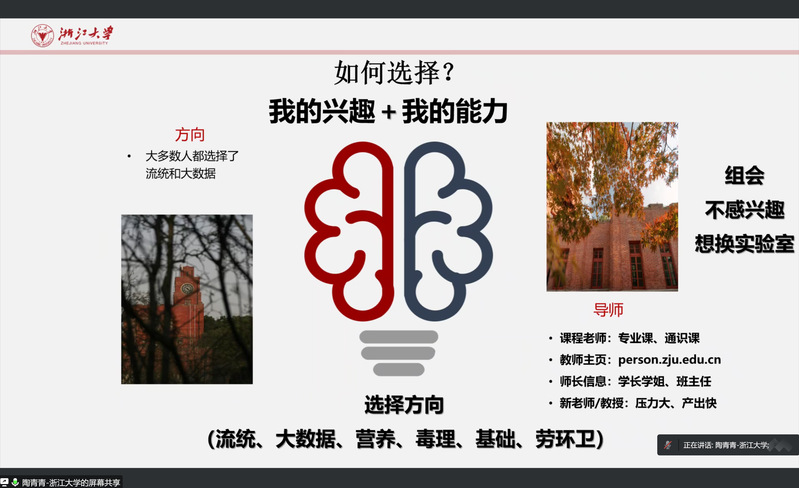 陶青青同志以“除了按部就班,我们还能做什么?”为题,讲述了预防医学科研、竞赛相关方面内容。陶青青同志对科研方向的选择给出以下建议:我们不能盲目跟风做科研,要抱着探索未知兴趣的心,做好投入时间与精力的准备,同时也要保证兼顾学业和科研。随后,陶青青同志详细介绍了科研需要的技能和工具,帮助大家更好地理解科研。此外,陶青青同志介绍了创赛竞赛相关内容,提出“以赛促学,增加专业认同感”的建议。