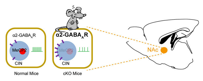 For the past four years Professor LI's team has focused on a protein called MeCP2, which encoded by the MECP2 gene, a transcriptional regulator whose mutations cause Rett syndrome (RTT).Researchers showed that Mecp2 gene deficiency in cholinergic interneurons of the nucleus accumbens (NAc) dramatically impaired fear learning. They further found that spontaneous activity of cholinergic interneurons in Mecp2-deficient mice decreased, mediated by enhanced inhibitory transmission via α2-containing GABAA receptors. With MeCP2 restoration, opto- and chemo-genetic activation, and RNA interference in ChAT-expressing interneurons of the NAc, impaired fear retrievals was rescued.