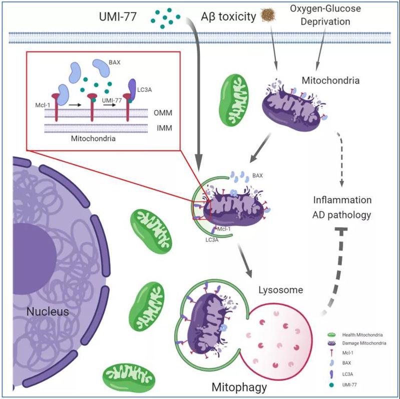 This study found that Mcl-1 is a new mitophagy receptor protein; UMI-77 can induce mitophagy by releasing free Mcl-1 protein, and reverse the pathological characteristics of Alzheimer's disease. This study suggests that Mcl-1 is a new drug target for the treatment of Alzheimer's disease, and inducing mitophagy is an effective strategy for the treatment of Alzheimer's disease.