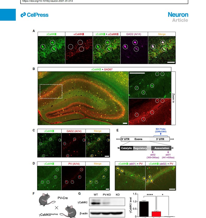 aCaMKII, the key mediator of LTPE-E, is absent from inhibitory interneurons and is not required for LTPE-I. The team of Prof. Ma leveraged recent technical advances, including sensitive RNAscope in situ hybridization (ISH) and immunostaining. They found gCaMKII, another isoform of CaMKII family, is enriched specifically in GABAergic interneurons, with particular enrichment in PV+ interneurons. They also found gCaMKII PV-KO mice, in which gCaMKII is selectively deleted in PV+ interneurons, showed reduced fear response in contextual CFC test. Their data strongly suggest that gCaMKII in hippocampal PV+ interneurons plays a critical role in hippocampus-dependent long-term memory.