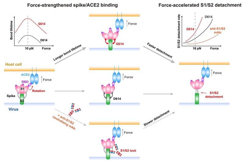 In addition, this study also identifies an anti-S1/S2 non-RBD-blocking antibody that is derived from convalescent COVID-19 patients and with potent neutralizing activity for virus infection can impede S1/S2 detachment by 3×106 times under force. Based on these findings, researchers propose an alternative non-RBD-blocking but S1/S2-binding neutralizing strategy: exploiting S1/S2-targeting mAbs to stabilize SARS2-S structure by locking SARS2-S conformation to prevent S1/S2 detachment and follow-up S2 fusion machinery formation. S1/S2-locking neutralizing strategy potentially can compensate or compliment receptor-blocking strategy no matter what other novel spike’s receptors are found.