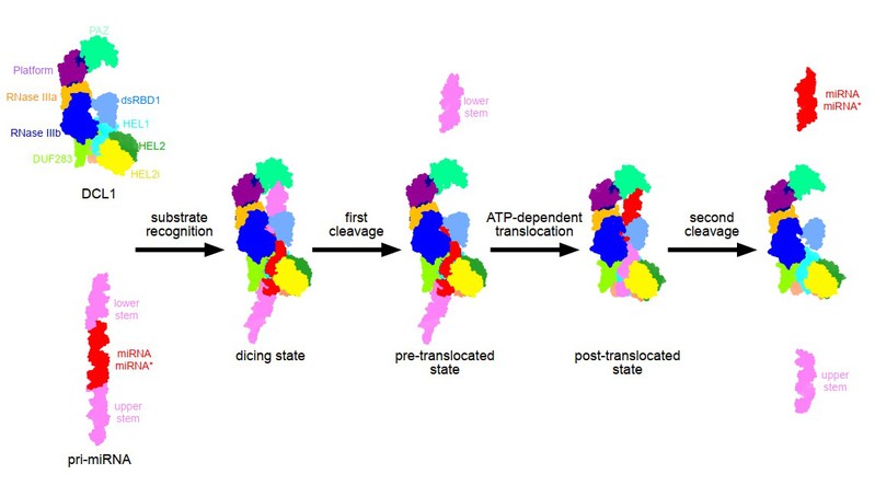 Based on this work and previous genetic and biochemical studies, researchers proposed a model for miRNA processing in plants. First, the PAZ domain recognizes and binds the internal loop of pri-miRNA. In the meantime, the helicase module clamps the duplex of pri-miRNA. In this configuration, the cleavage sites are aligned with the RNase III active centers with the assistance of dsRBD1. After the first cleavage, pre-miRNA translocates towards the PAZ domain in an ATP-dependent manner. As soon as the 3 overhang reaches the PAZ domain, it is captured by the 3 overhang binding pocket, which aligns the cleavage sites with the RNase III active centers again.
