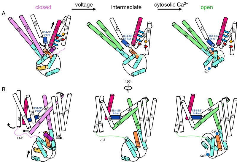 Upon membrane depolarization, the global movement of VSDII is initiated by the vertical translation of IIS4 with gating charge residues passing through gating charge transfer center. The activation of VSDII not only causes IIS6 helix pair to dilate further away from the central axis of the channel pore, but also pulls the EF-hand domain through L1-2, allowing the Ca2+ binding sites at S0 and EF hand 2 to be exposed. The binding of Ca2+, together with dragging by VSDII, induces the translation and rotation of E1 away from its original position. Since E1 and IS6 form a single helix, the motion of E1 directly causes an outward movement of IS6. With the enlarged pore along the directions of IS6 and IIS6 pairs, the channel opens.