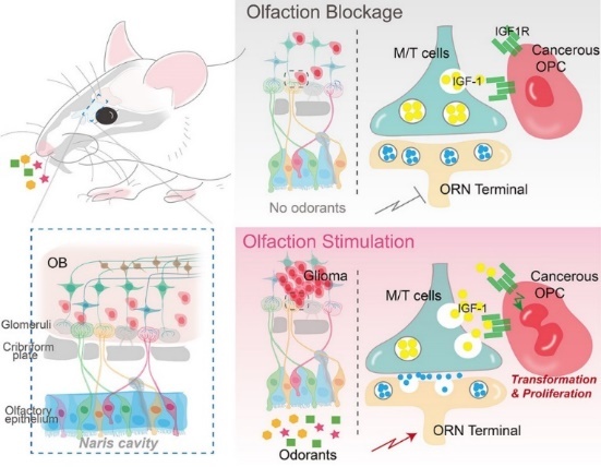 Insulin-like growth factor 1 (IGF1) plays important roles in normal olfactory behavior in mice, and its expression and / or secretion in neurons has been suggested to be activity-dependent. Prof. Liu and his team built an innovative mouse model which can induce gliomagenesis and, simultaneously knock out IGF1 specifically in M/T cells. The results clearly demonstrated that knockout of IGF-1 in M/T cells resulted in a remarkable reduction in tumor volume. In subsequent experiments, they simultaneously activated olfactory sensory neurons and blocked IGF1 signaling pathways; and found that the pro-tumoral effects induced by olfactory activation were completely abolished. This is the key solid evidence to demonstrate thatolfactory activity regulates gliomagenesis principally through IGF1 signaling pathways.
