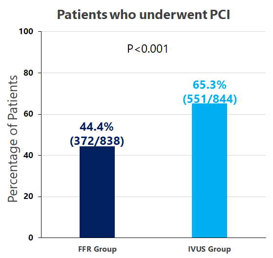 According to the prespecified criteria for revascularization, 44.4% of patients in the FFR group and 65.3% of those in the IVUS group underwent PCI. At 24 months, a primary-outcome event had occurred in 8.1% of the patients in the FFR group and in 8.5% of those in the IVUS group with non-inferiority p=0.01.