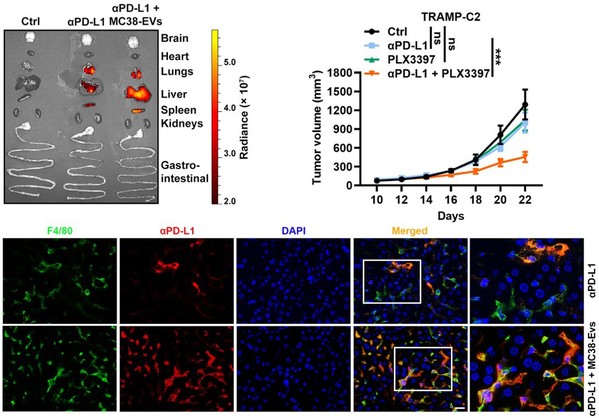 Furthermore, it is found that after binding TEVs, αPD-L1 is more taken up by phagocytes in the liver and spleen, leading to accelerated degradation and decreased tumor delivery of αPD-L1. In addition, they found that depletion of macrophages by Pexidartinib (PLX3397), which markedly reduced the numbers of peripheral monocytes and liver macrophages, eliminated αPD-L1-therapy resistance in TRAMP-C2-bearing mice. These results demonstrate that targeting macrophages effectively prevents the clearance of TEV-bound αPD-L1, thus improving the utilization efficiency and therapy resistance of αPD-L1.